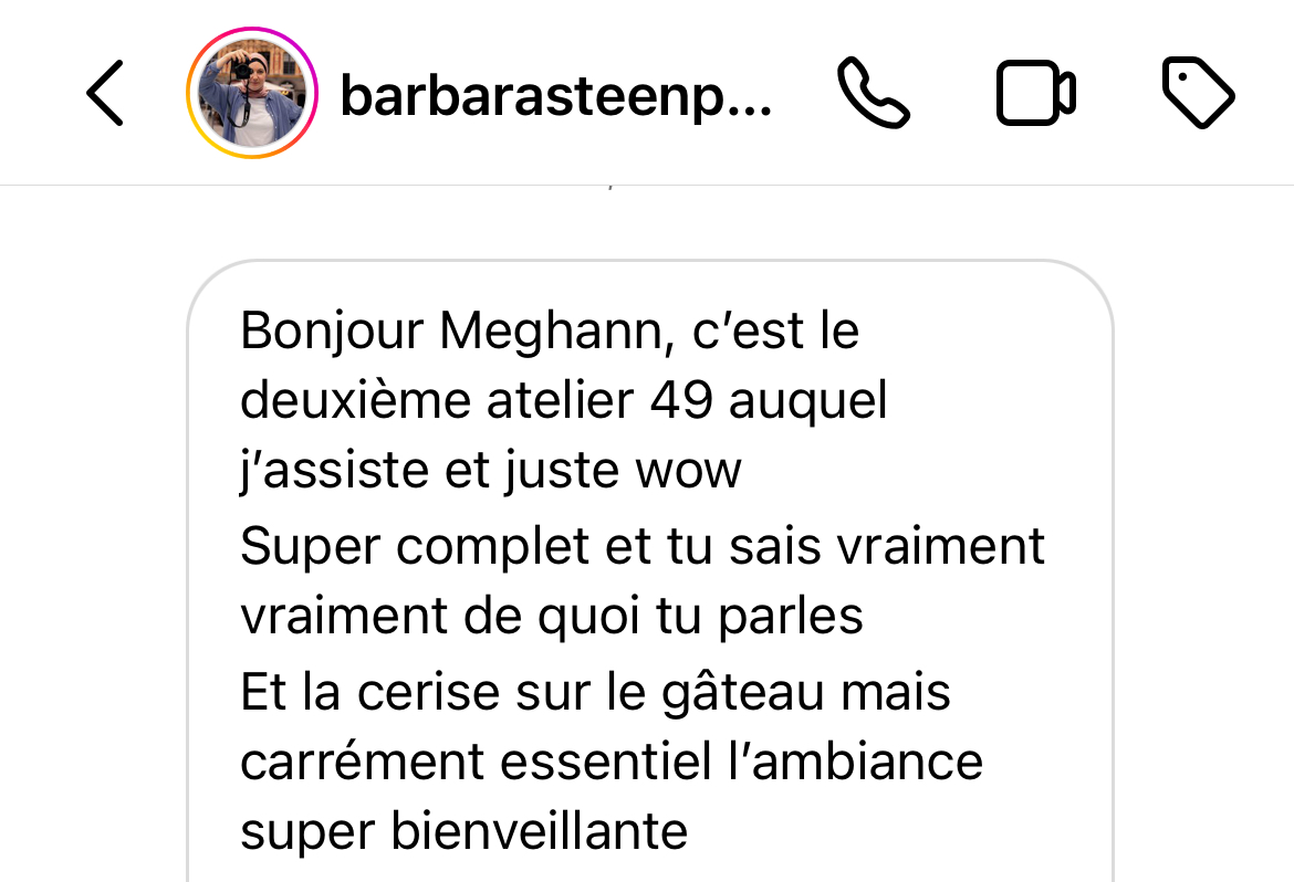 De 2h (au moins) d'atelier enregistré en interaction : je construis pour et avec les photographes.